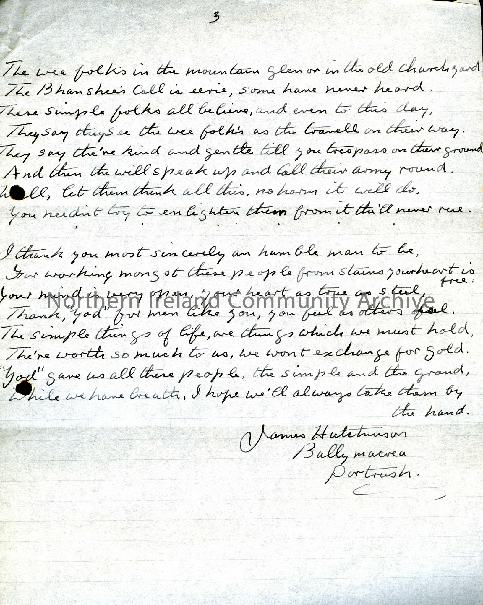 Third page of a poem sent to Sam by James Hutchinson of Ballymacrea. The final verses sum up by giving thanks to God foar a man like Sam who appreciates the worth of the simple things in life.