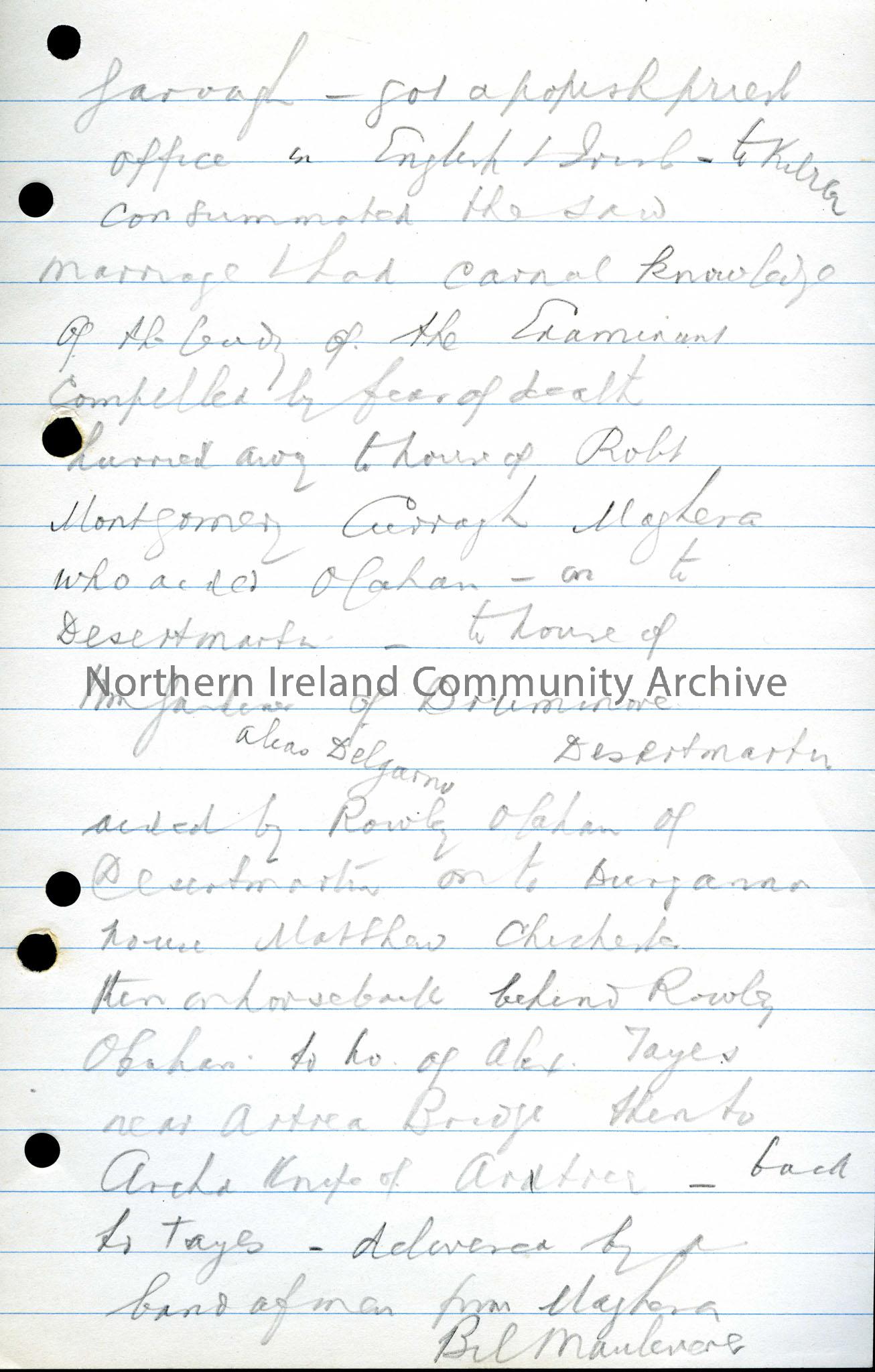 Third page of a series of hand written historical notes. This page describes the forced marriage and the journey from house to house of friends of O'Cahan. Names mentioned include Robert Montgomery, Rowley O'Cahan, Matthew Chichester and Archibald Knipe.