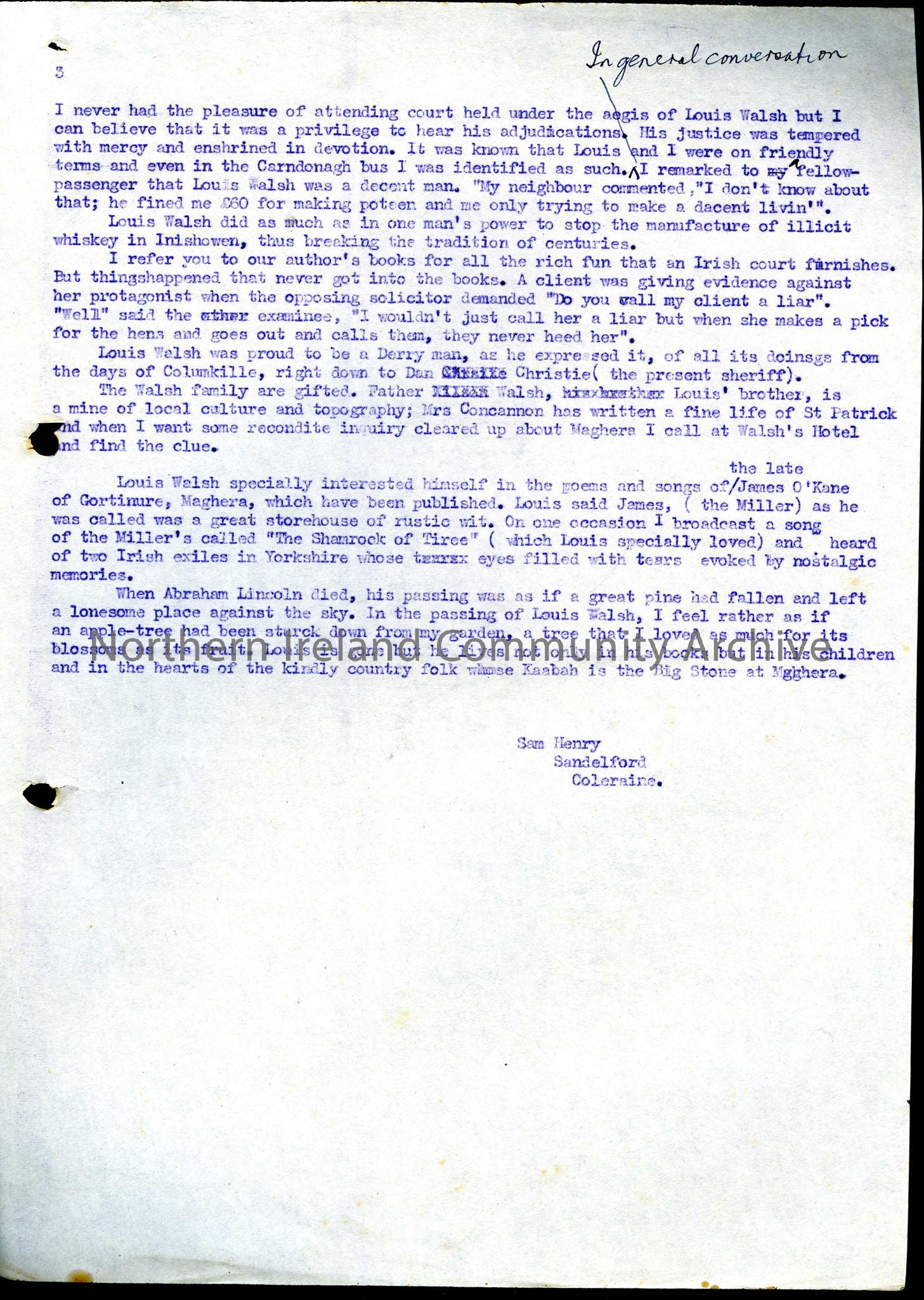 Third page of an article written as a tribute to Louis Walsh of Maghera. Sam speaks of Louis Walsh's career in the law and of his attempts to stop the illicit manufacture of poteen. He mentions that Louis was particularly interested in the poems and songs of James O'Kane of Gortmore.
