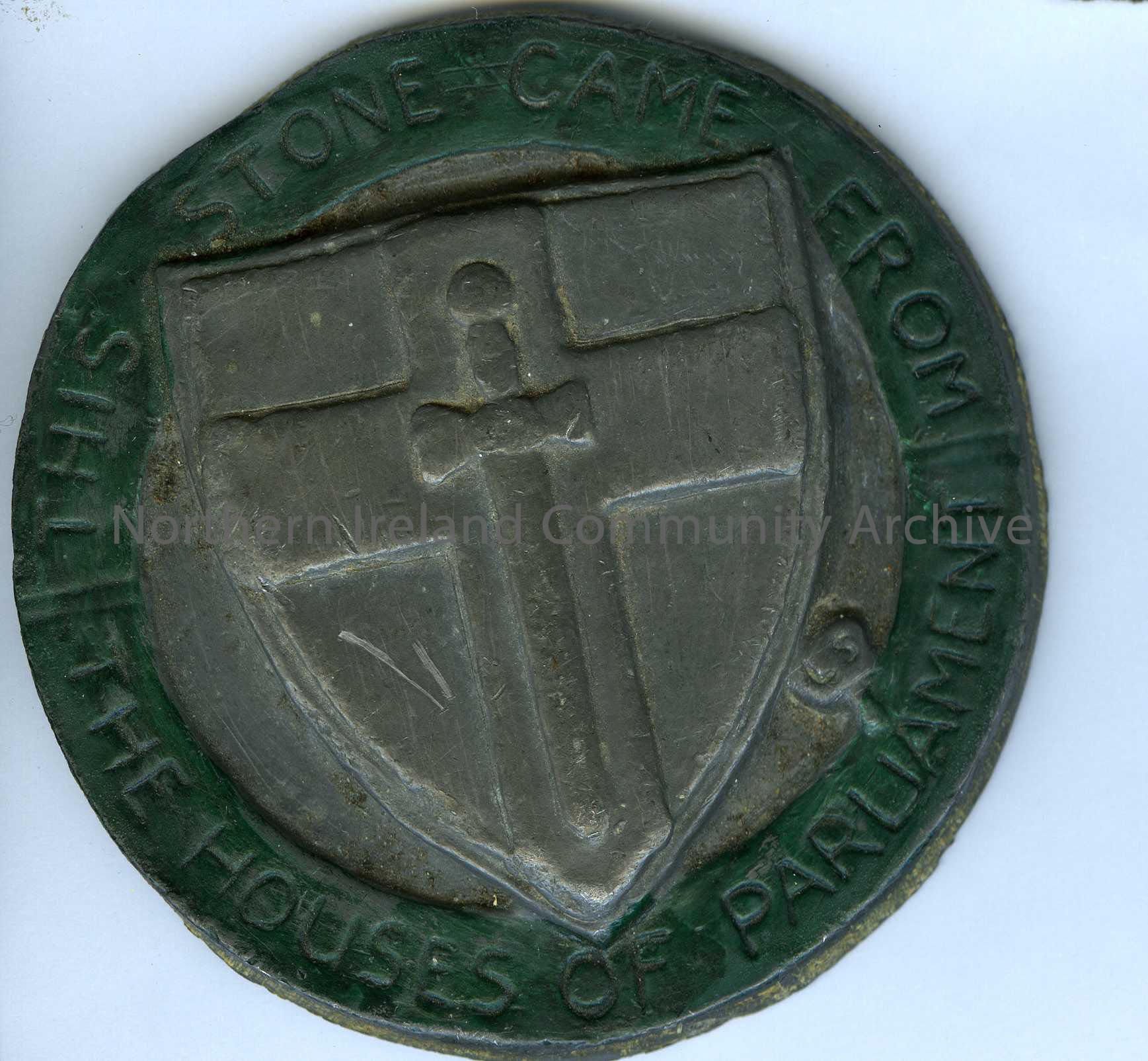 metal shield titled, This Stone Came From The Houses Of Parliament. With shield and sword in relief