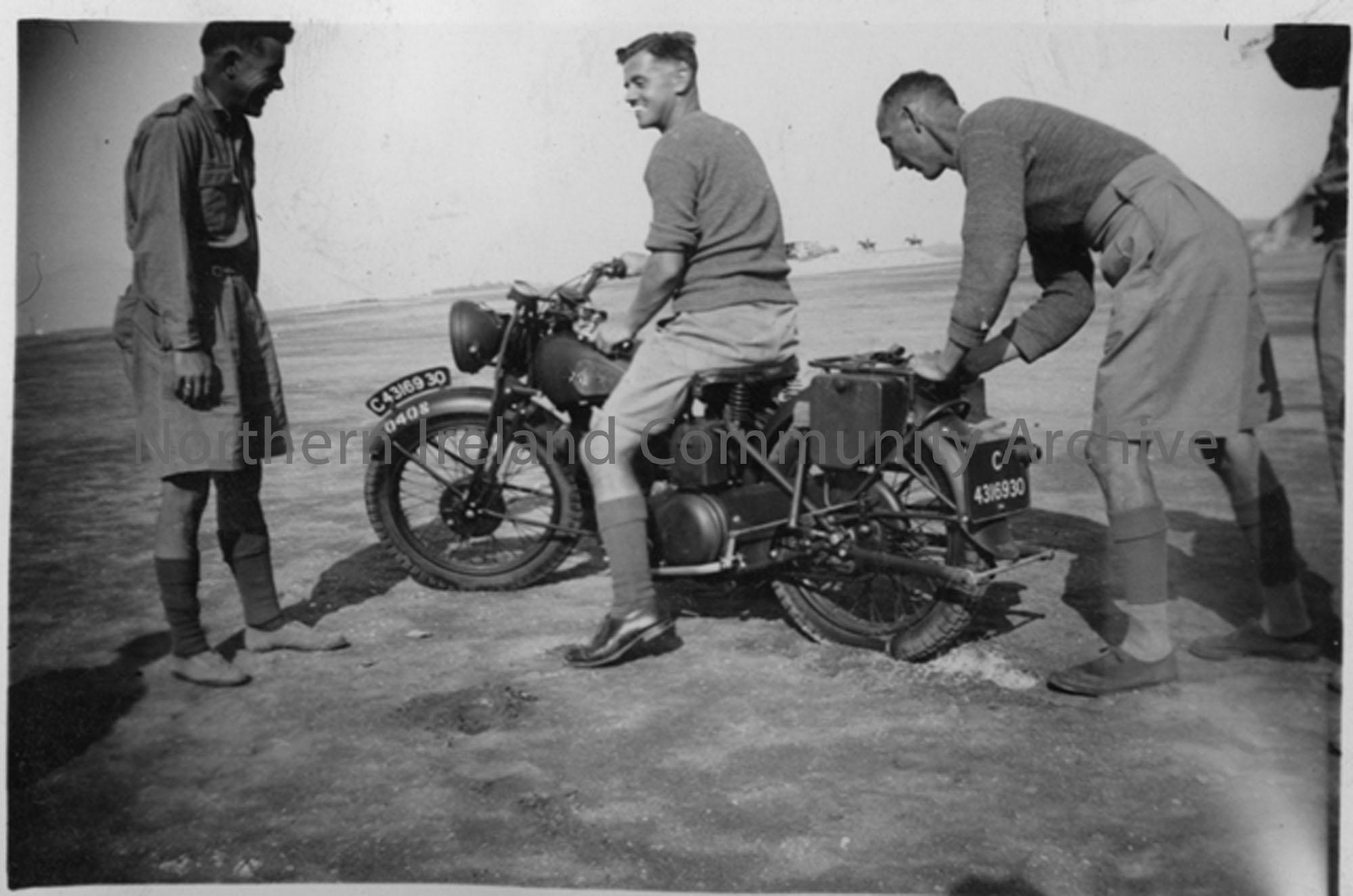 3 Gunners with a motor bike. Includes: W Oliver and J Hamilton