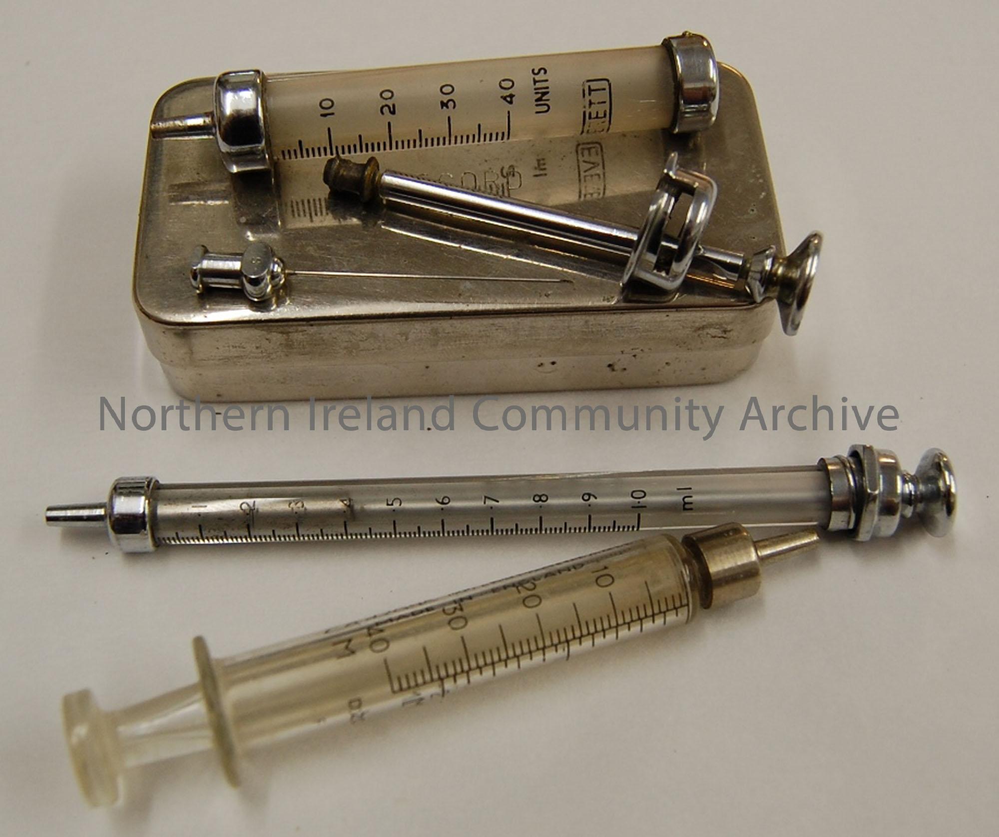 Three syringes and box, one syringe dismantled