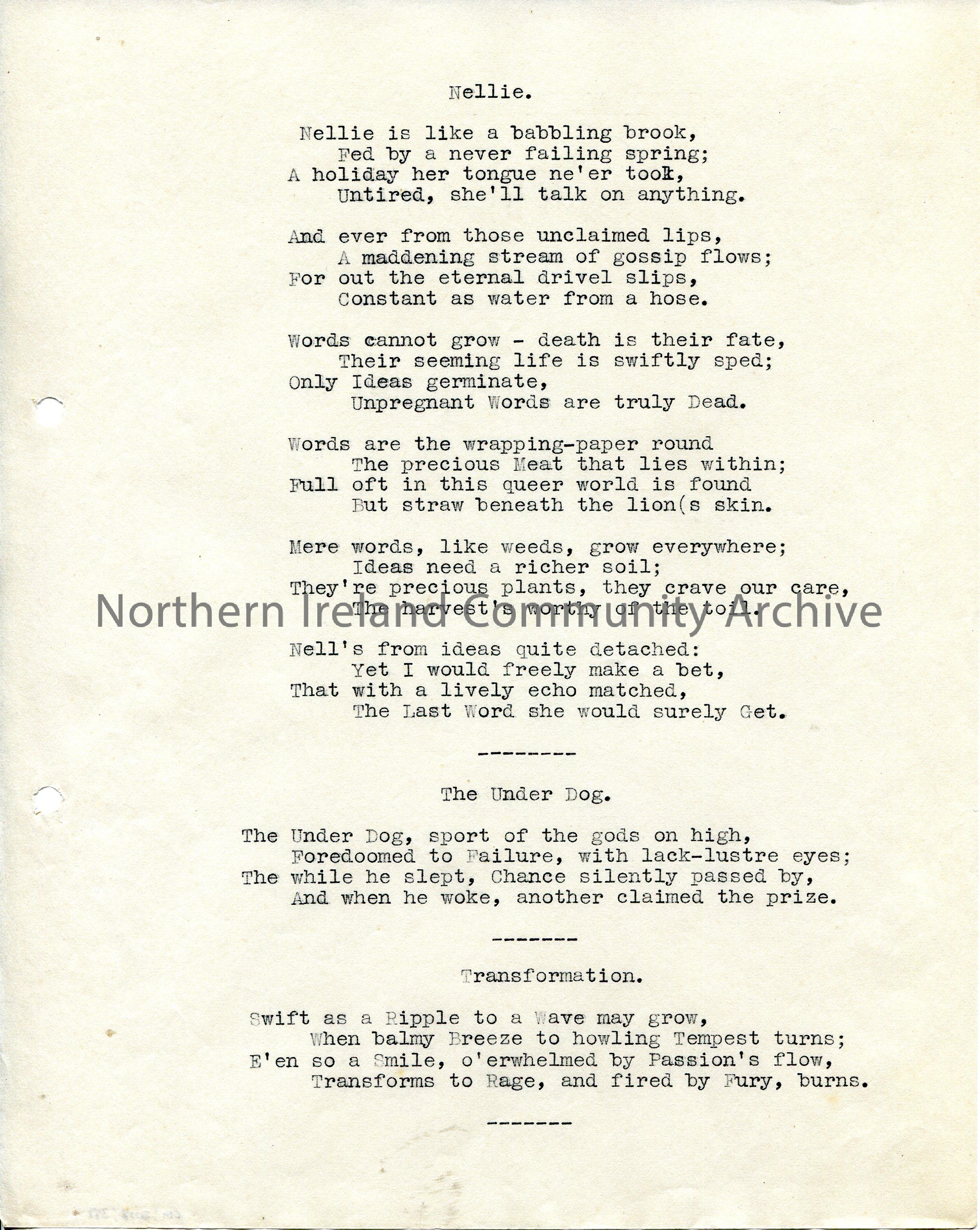 Three typed poems titled, ‘Nellie’, ‘The Underdog’, and ‘Transformation’.