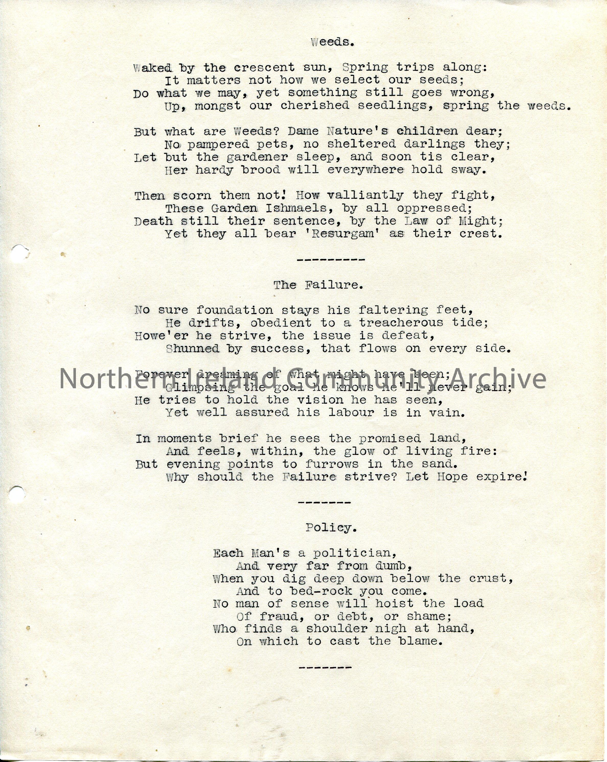 Three typed poems titled, ‘Weeds’, ‘The Failure’, and ‘Policy’.