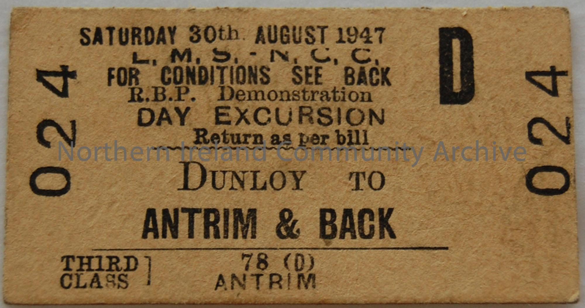 ticket issued by LMS. NCC. Third class day excursion ticket to Royal Black Preceptory Demonstration on Saturday 30th August, 1947