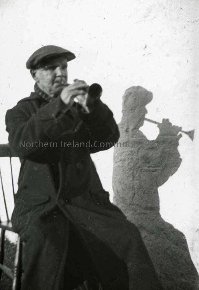 Man playing tin whistle with expanded end piece. (JM - Simon O'Doherty, who played at the hiring fair in Coleraine on a Saturday and was heard again in Bushmills the following Monday. The funnel on the whistle was his own invention and amplified the sound for busking. Belfast Public Library scrapbook page 1 has an articlecalled 'The Fluter at the Fiar' from 1933, establishing the day he played and that, though he lived in Connemara, he was a grandson of Simon O'Doherty, a piper from Letterkenny. Likely was a member of the 'Simey' Dohertys who last century (?20th) produced the notables Johnny, Mickey and Simon - all, especially the first, recorded by the BBC, RTE and others)