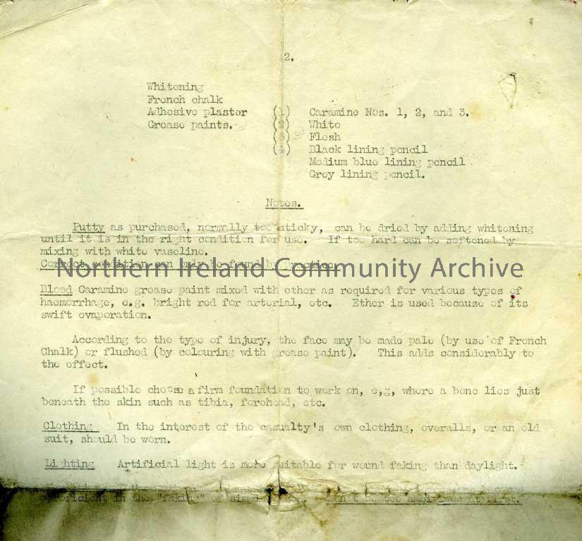 Titled “First Aid Party Leaders’ Course. Faking of Casualties – Notes”. Details how to create wounds, how to create the illusion of an amputated arm a… – 126B