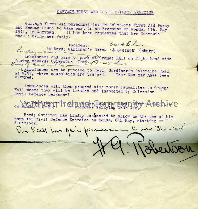 Titled “Garvagh first aid civil defence exercise”. Typed letter with handwritten corrections. Appears to be a first draft of CM:2011:133.