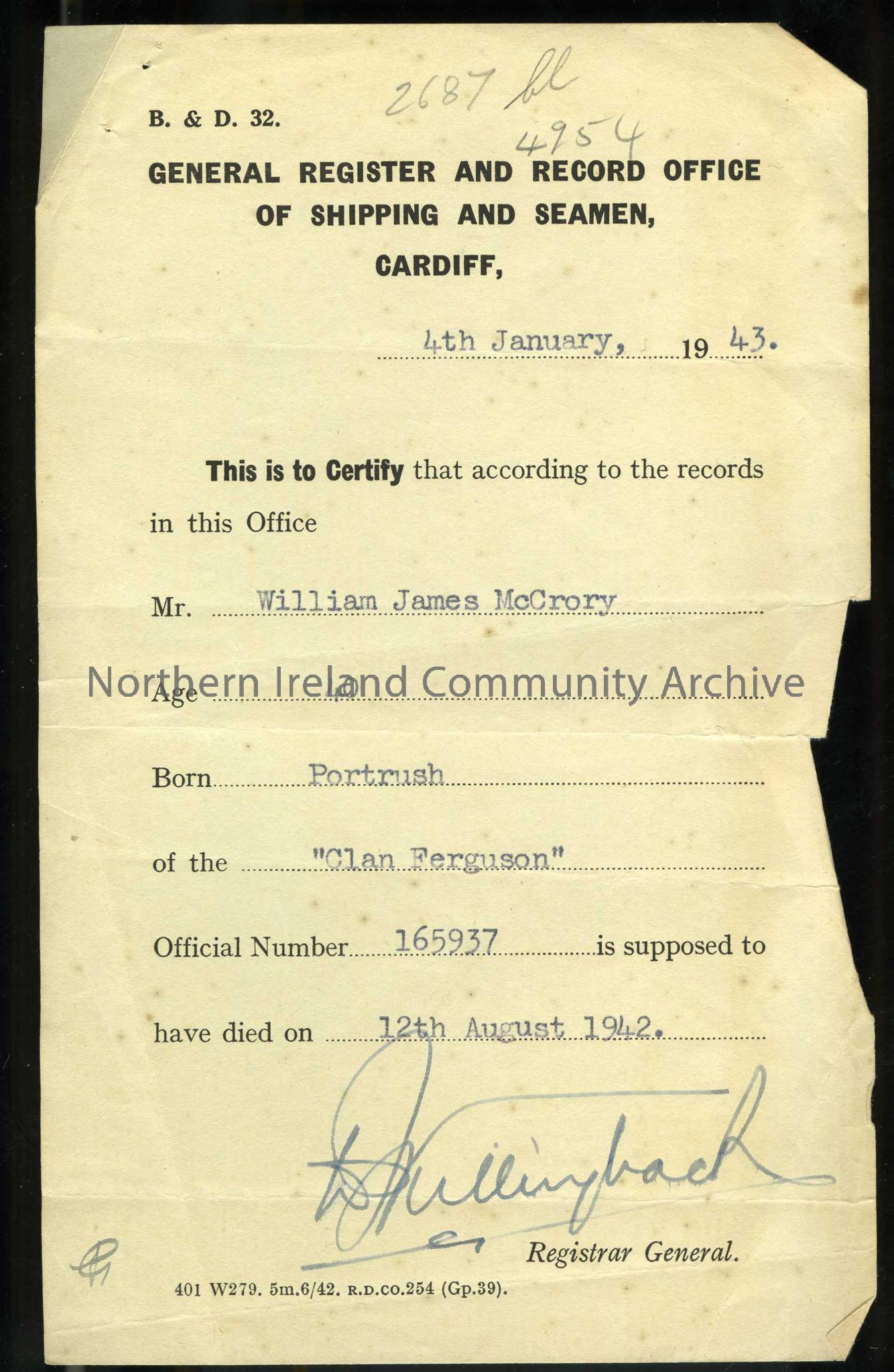 Titled 'General Register and Record Office of Shipping and Seamen, Cardiff'. To certify that William James McCrory, aged 40, born at Portrush, is supposed to have died on 12th August 1942. Signed by the Registrar General.