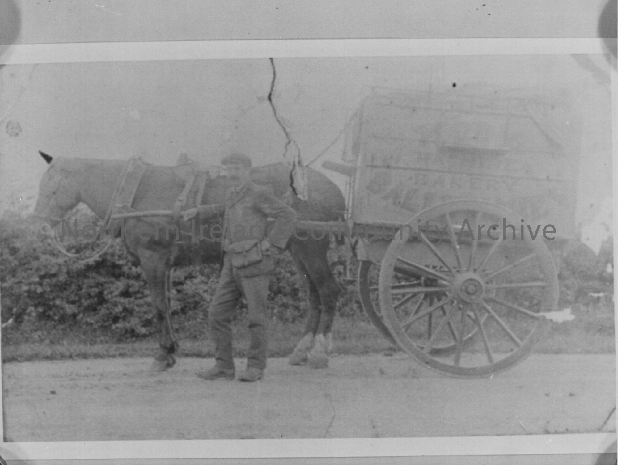 Todd’s horse-drawn bakery van, with the donor’s father standing beside it.