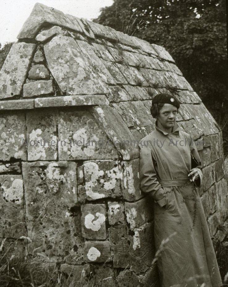 Woman leaning against stone built tomb of Murragh O'Heaney (Saint - mythical or real?? - Lough Foyle area)