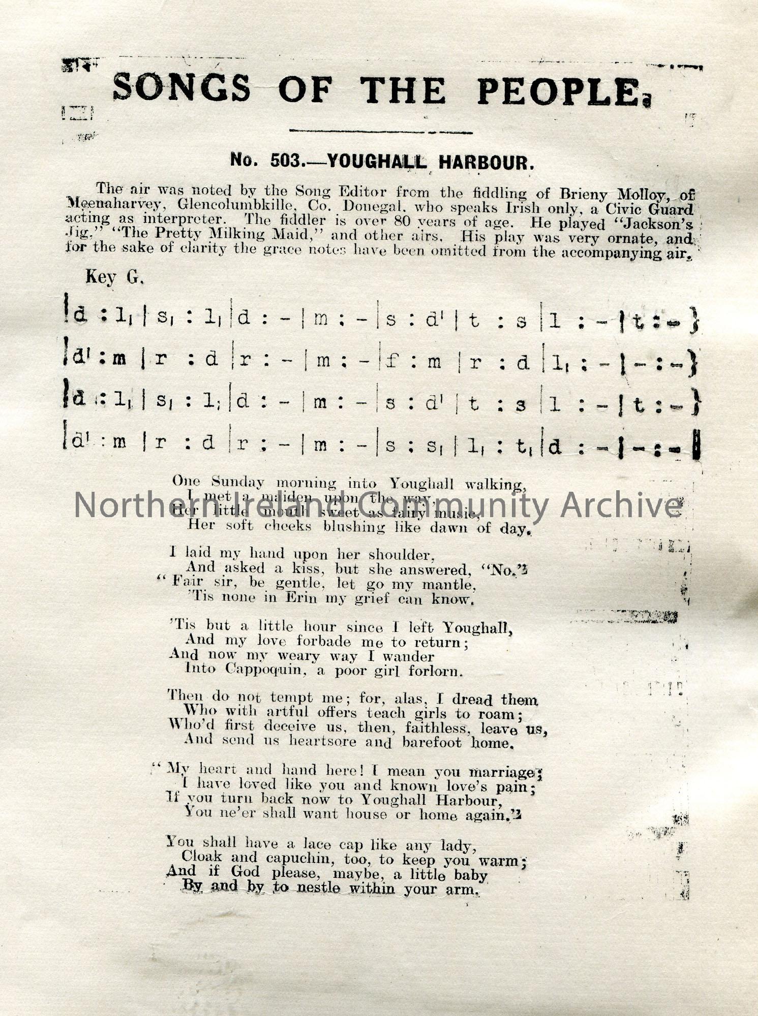 Tonic sol-fa and words to song titled, 'No. 503 - Youghall Harbour'. Noted by Sam Henry from the fiddling of Brieny Molloy, Meenaharvey, Glencolumbkille, Co. Donegal, who spoke Irish only, a Civic Guard acting as interpreter.