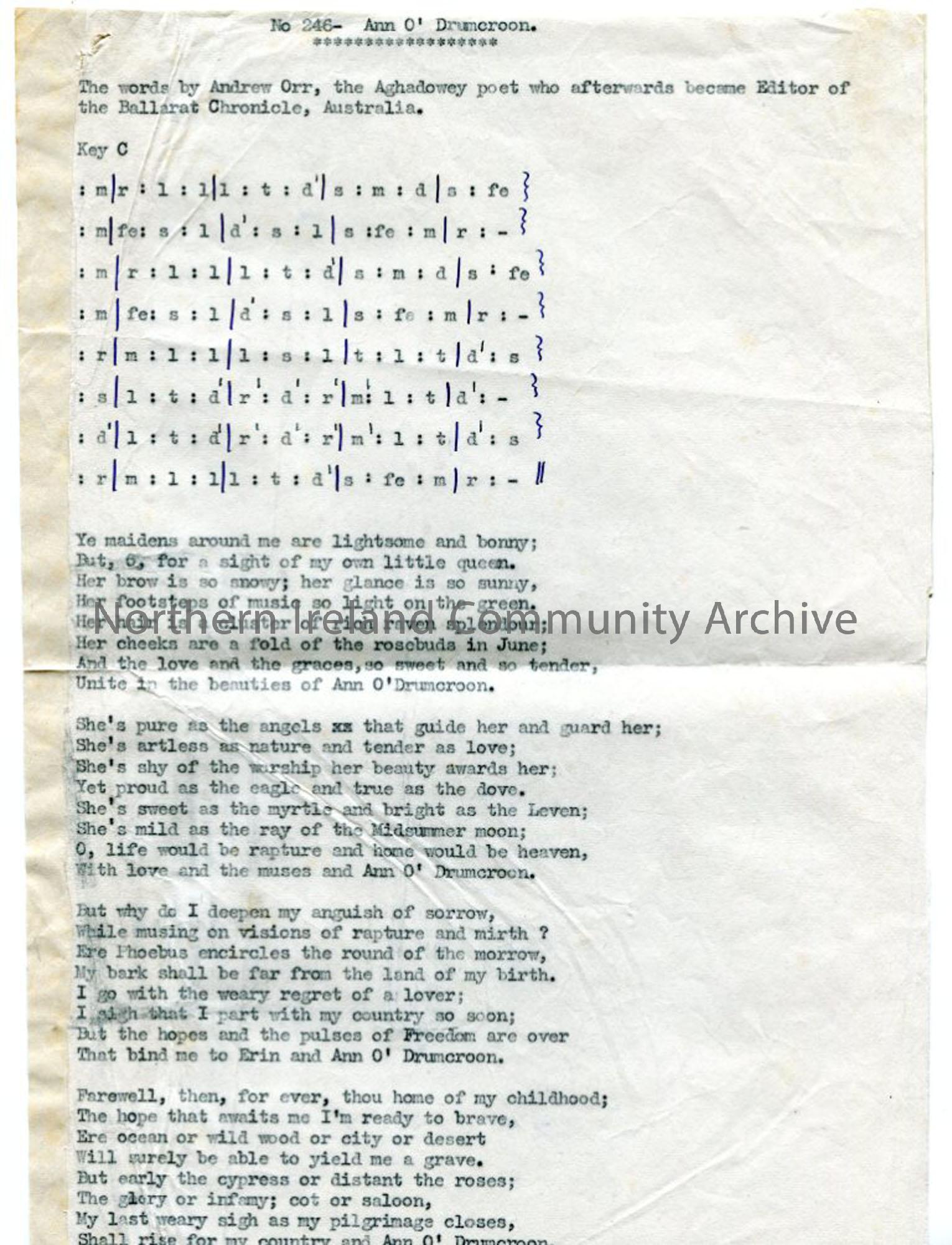 Typed tonic sol-fa notation and words to 'Ann O' Drumcroon' by Andrew Orr.