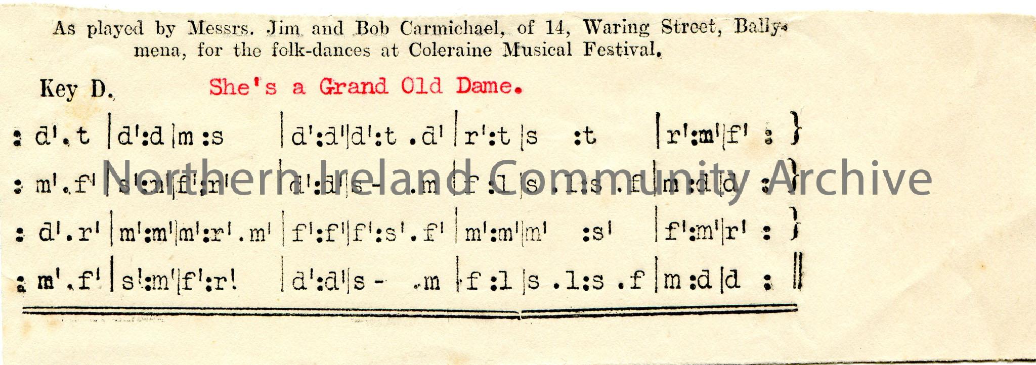 Tonic sol-fa notation to ‘She’s a Grand Old Dame’. Played by Jim and Bob Carmichael of 14 Waring Street, Ballymena for folk dances at Coleraine Music …
