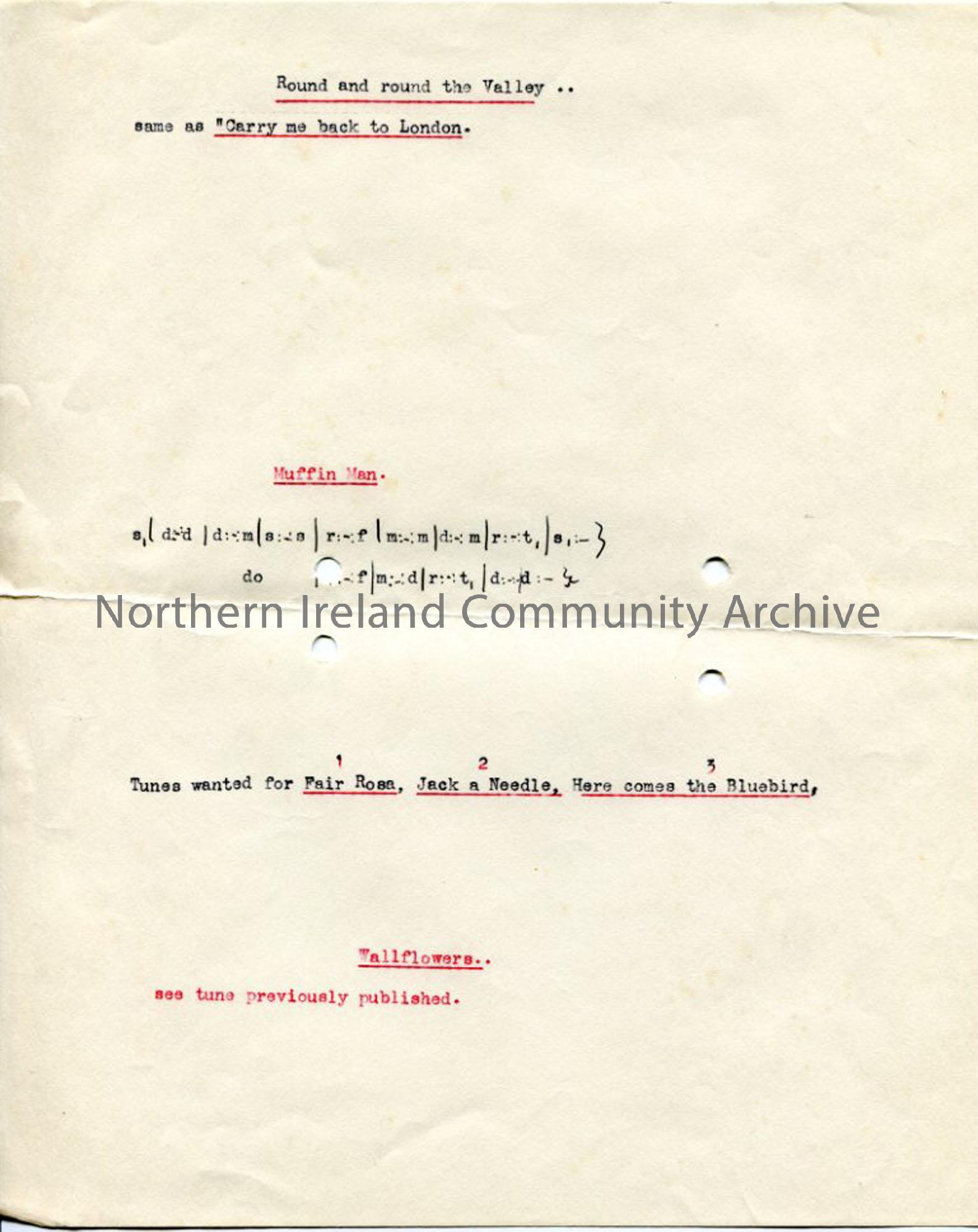 Few brief typed notes - song titles, tonic sol-fa to 'Muffin man', tunes wanted for verses of singing games supplied by Park Street girls.