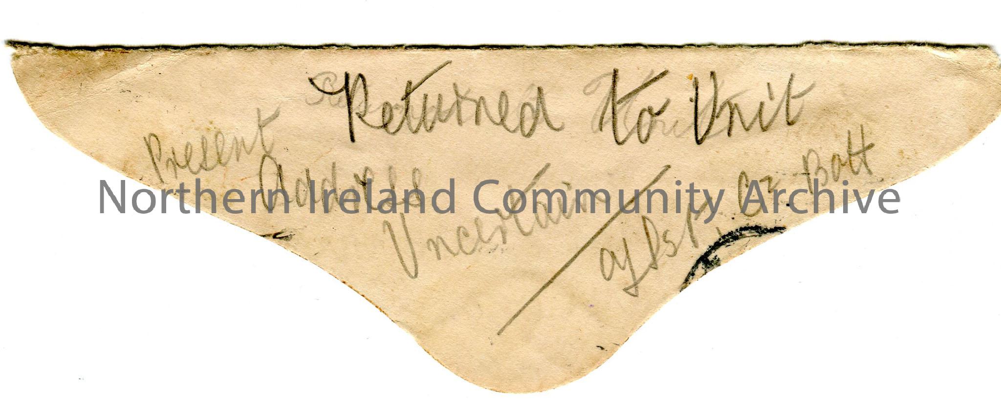Top flap of cream addressed envelope, sent to Private Jim Henry at Grantham but readdressed to Mrs Henry, Taylors Row. In pencil notes that James has returned to unit and present address uncertain