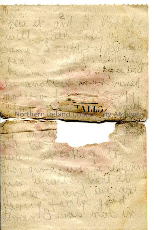 Top half of one of 4 pages of handwritten letter from James to his father. Large sections missing due to damage. Was in field ambulance 4 days with sore throat. Moving to another battalion. Glad Sandy is better and William has plot of ground to grow crops [brothers]. Mentions Georgina, Sammie Millar and a Morrow