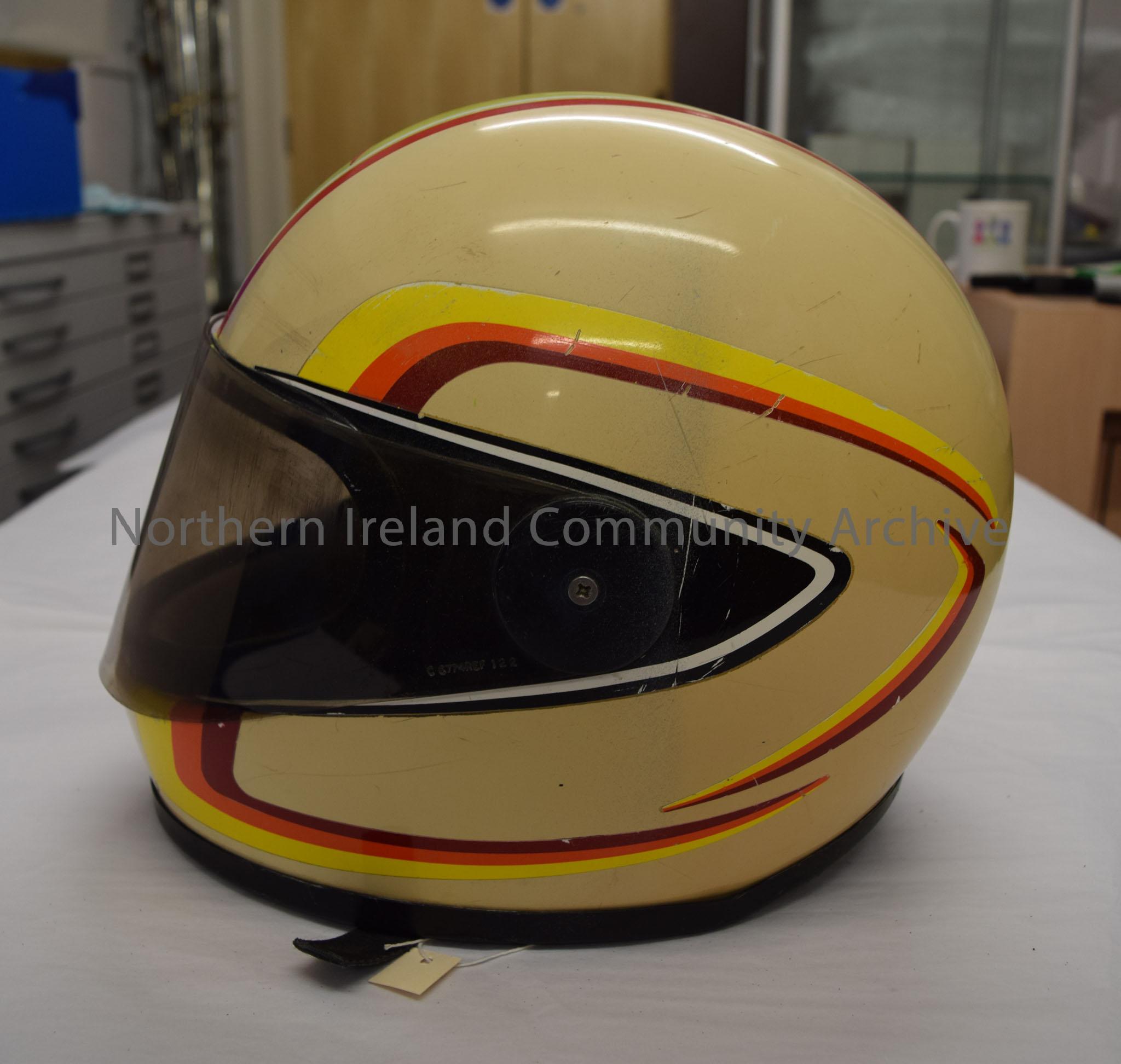 Top Tek motorcycle helmet. Cream with green/yellow stripe down the middle with a red border and red T in the centre. Yellow, red and burgundy stripes … – 2016.10 (3)