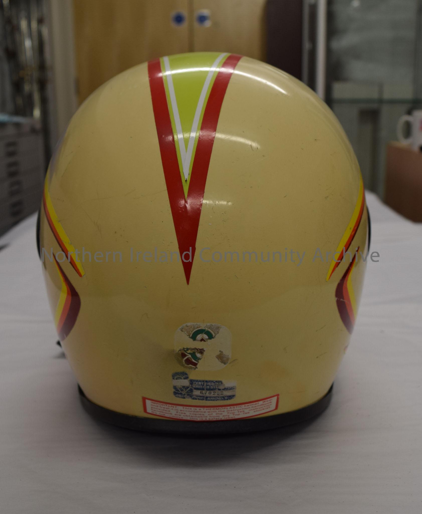 Top Tek motorcycle helmet. Cream with green/yellow stripe down the middle with a red border and red T in the centre. Yellow, red and burgundy stripes … – 2016.10 (4)