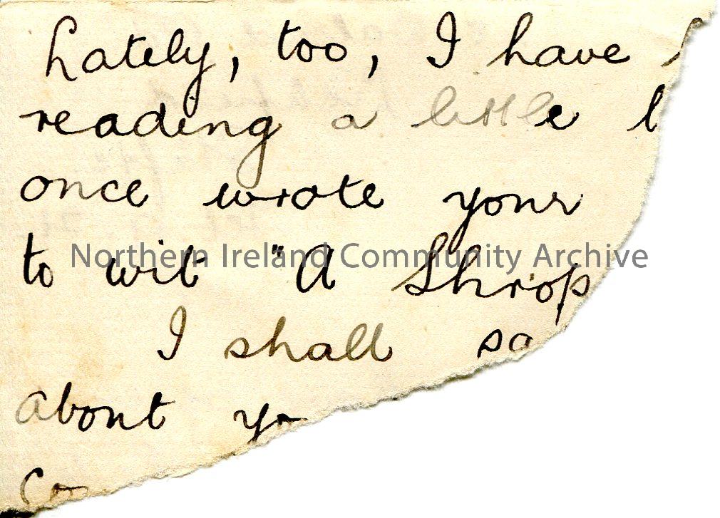 Torn off piece of paper from a letter for address of 48 Walsall Road, Lichfield, Staffordshire. Writing from letter on reverse. – scan017b