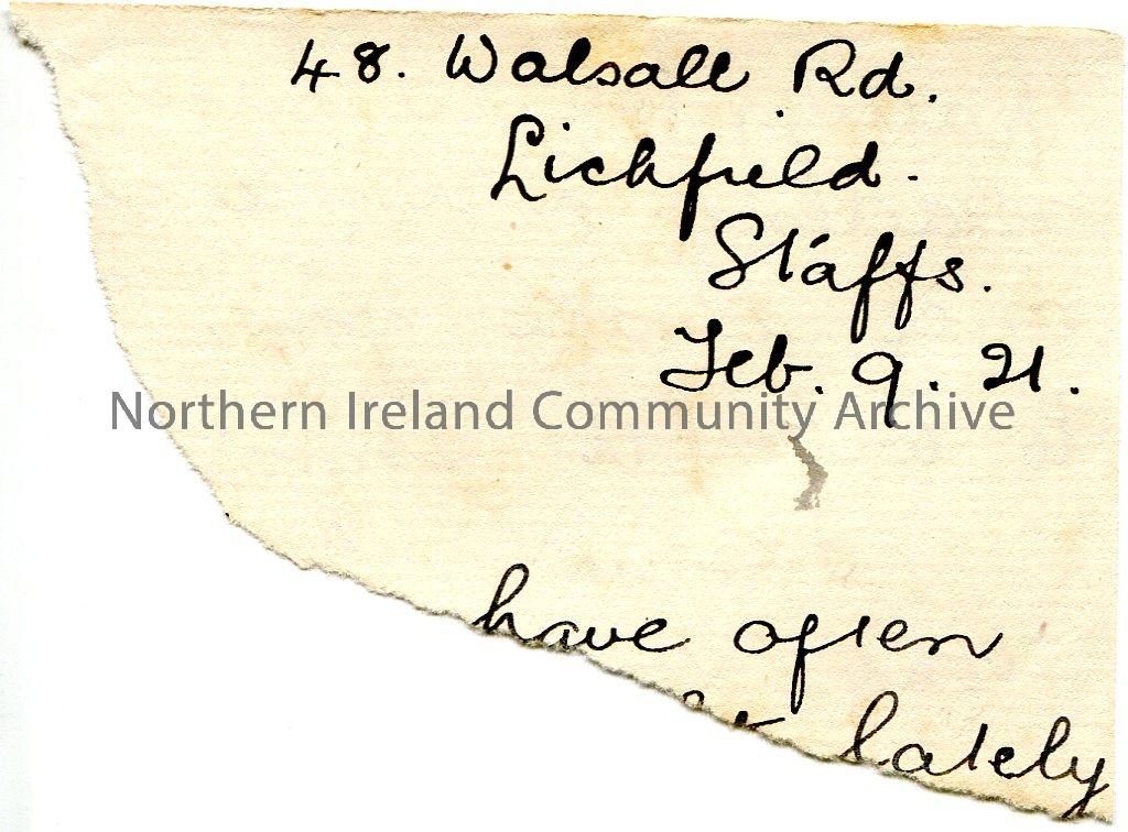 Torn off piece of paper from a letter for address of 48 Walsall Road, Lichfield, Staffordshire. Writing from letter on reverse.