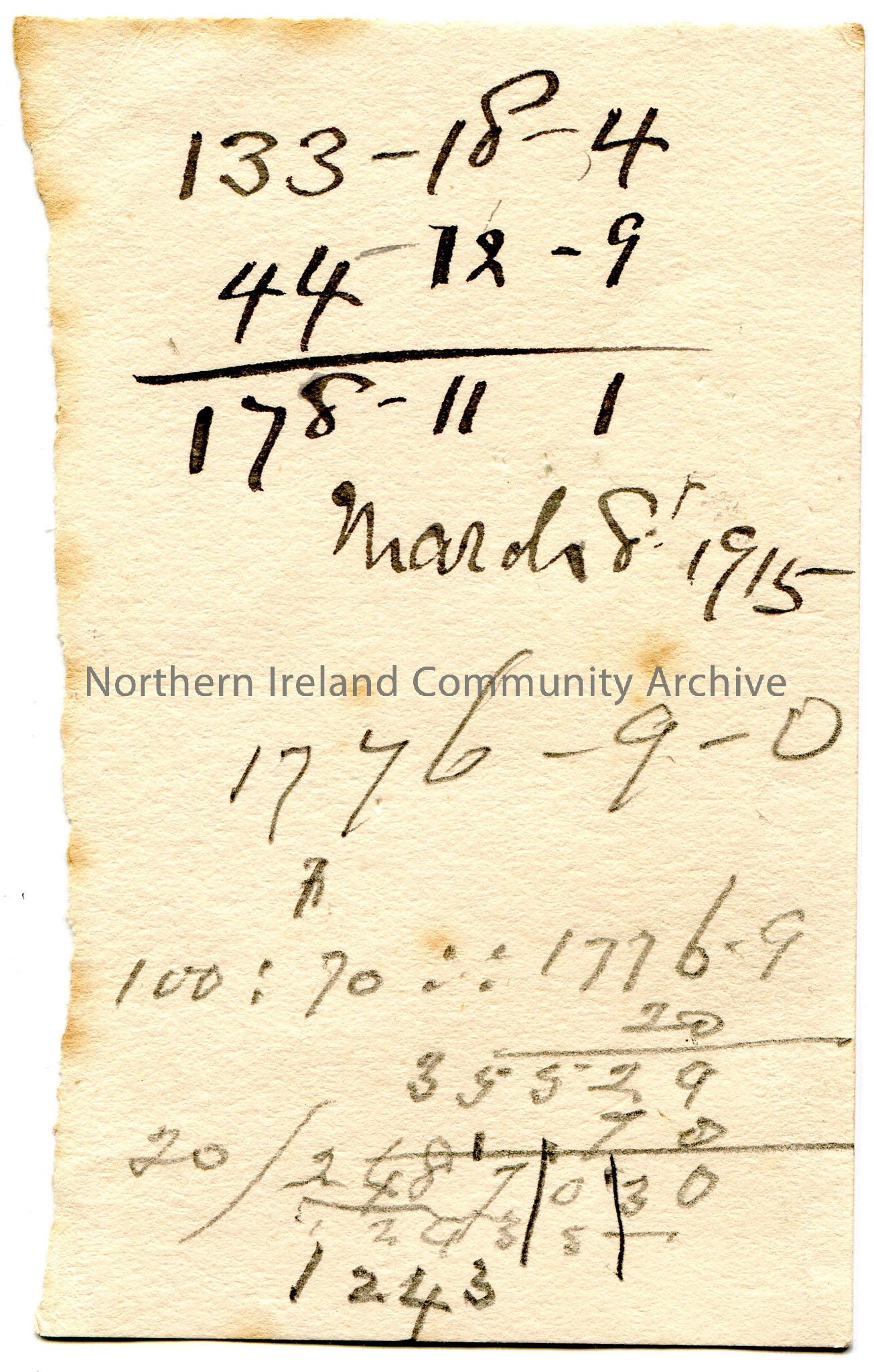 Torn off piece of paper with handwritten rough notes re sums of money.