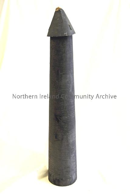 Irish Round Tower model. Made from thin lino and stained with lamp black or logwood chips. Possibly a copy of the Round Tower at Antrim. Courtesy of Ballycastle Museum.