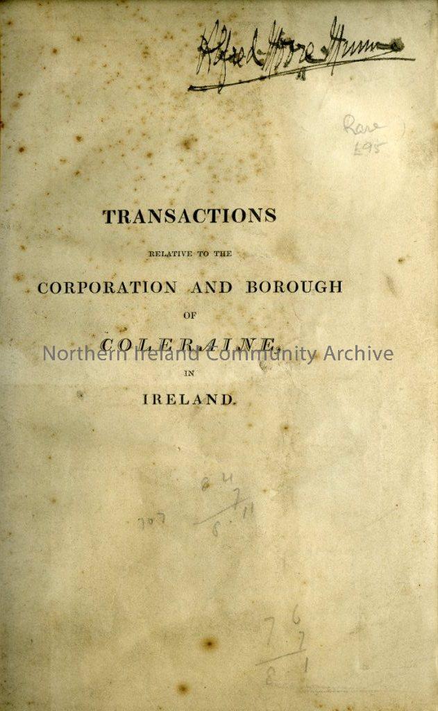 Transactions Relative to the Corporation and Borough of Coleraine in Ireland. Signature inside the cover of possibly Alfred Moore Hume (5896)