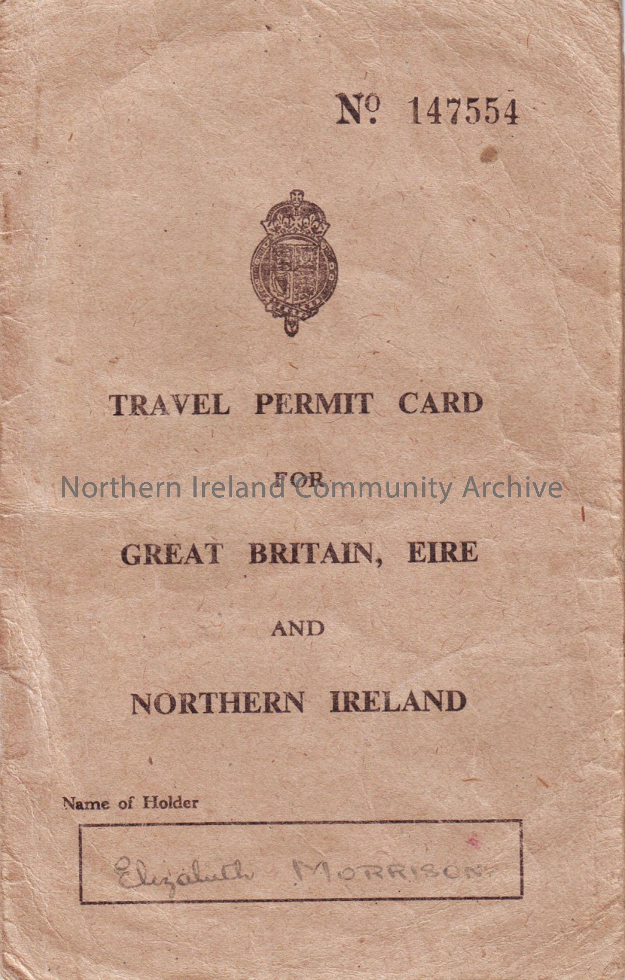 Travel Permit Card belonging to Elizabeth Morrison (later Craig), dated 26th June 1945. No. 147554. Includes personal details and photograph
