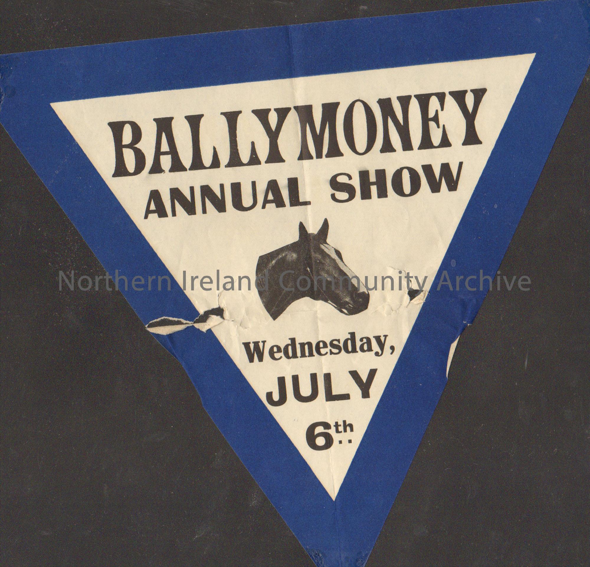 Triangular poster for Ballymoney Annual Show with a blue frame and a horses head on.