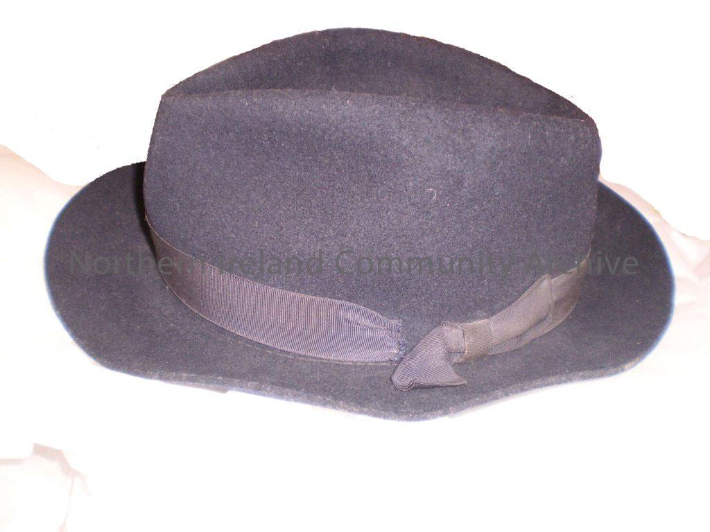 Trilby black hat which belonged to Ronnie Gamble’s father. He was given this when he was demobed from military service. The label on the inside reads …