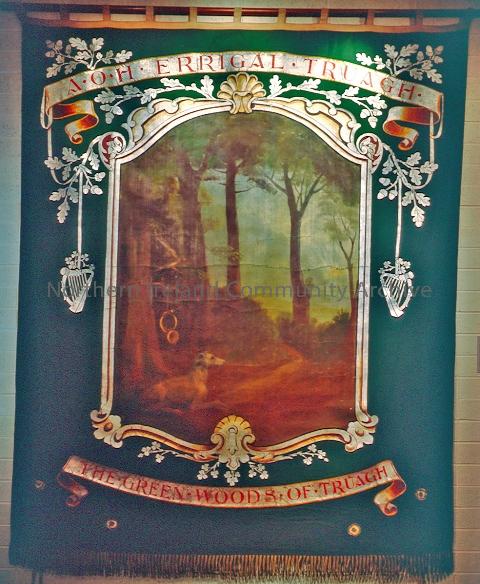 Truagh Ancient order of Hibernian banner featuring forest scene and wolf hound. Courtesy of Monaghan Museum. (ref wtc123)
