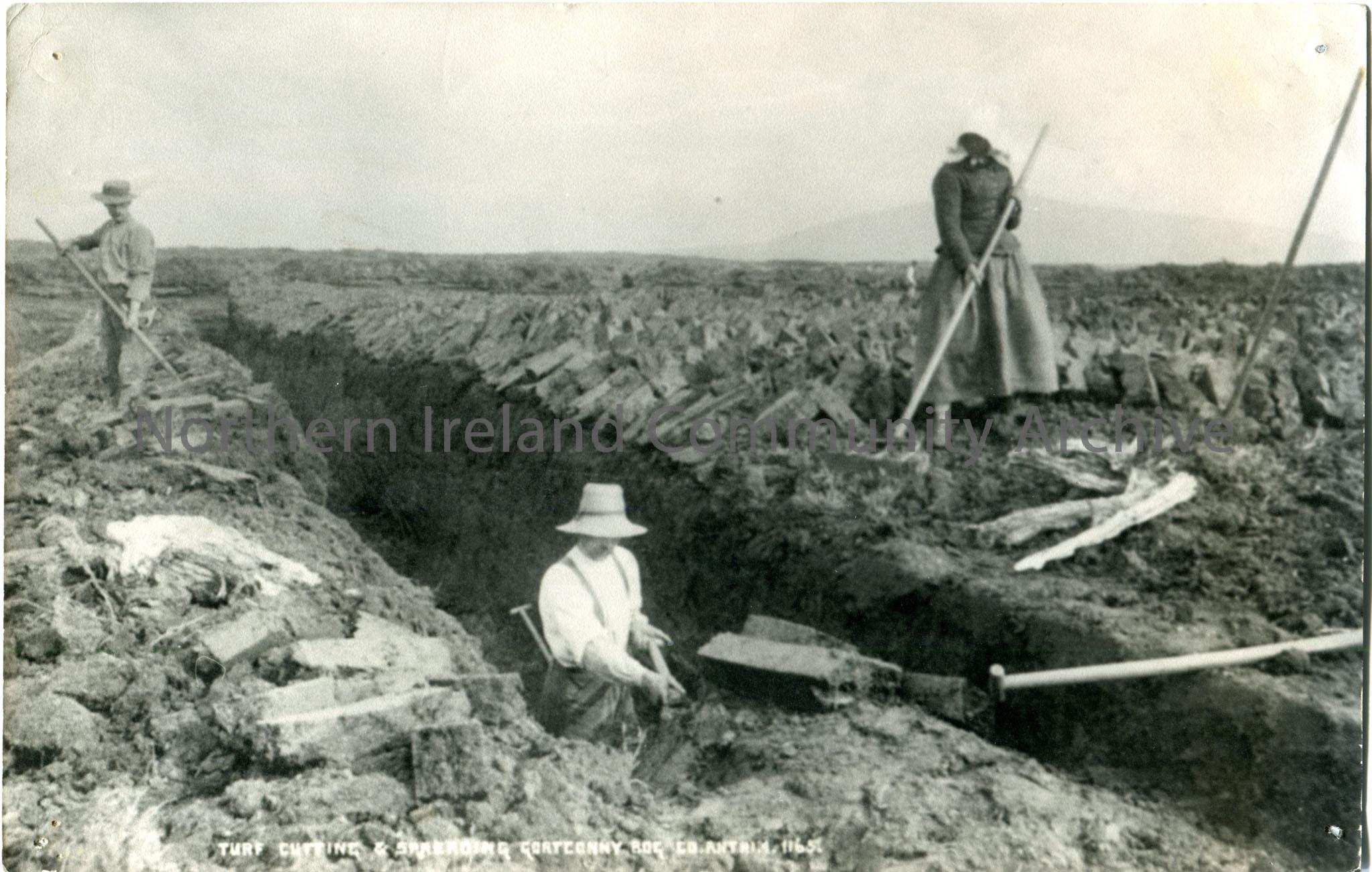 Turf cutting at Gortconny Bog, Co. Antrim. Donation recorded on back of rear of photograph.
