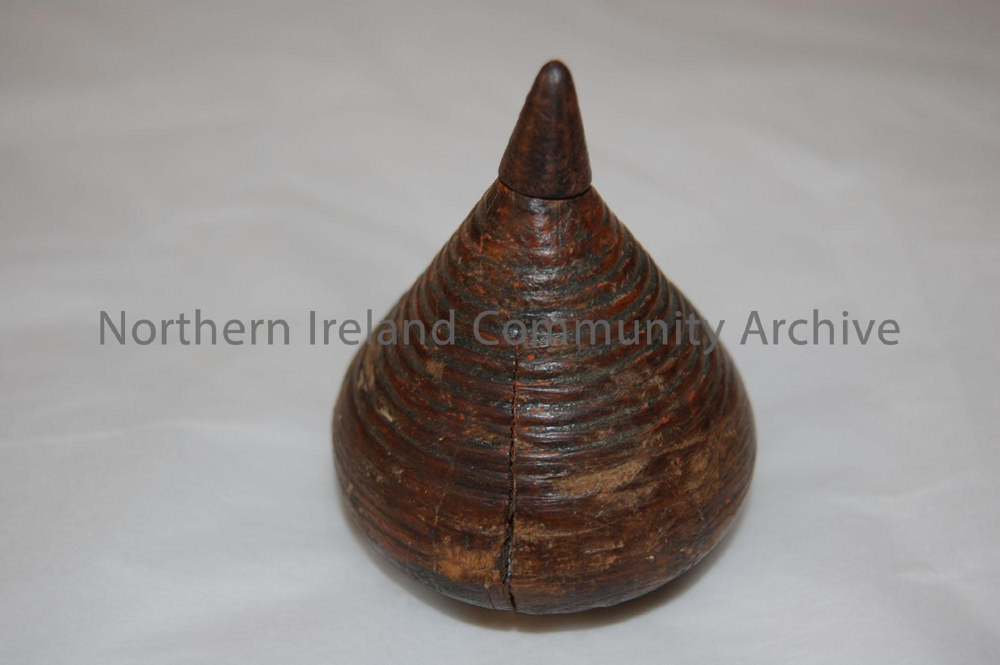 Turned pear shaped wooden top with metal tip and grooves for winding whip chord around it.