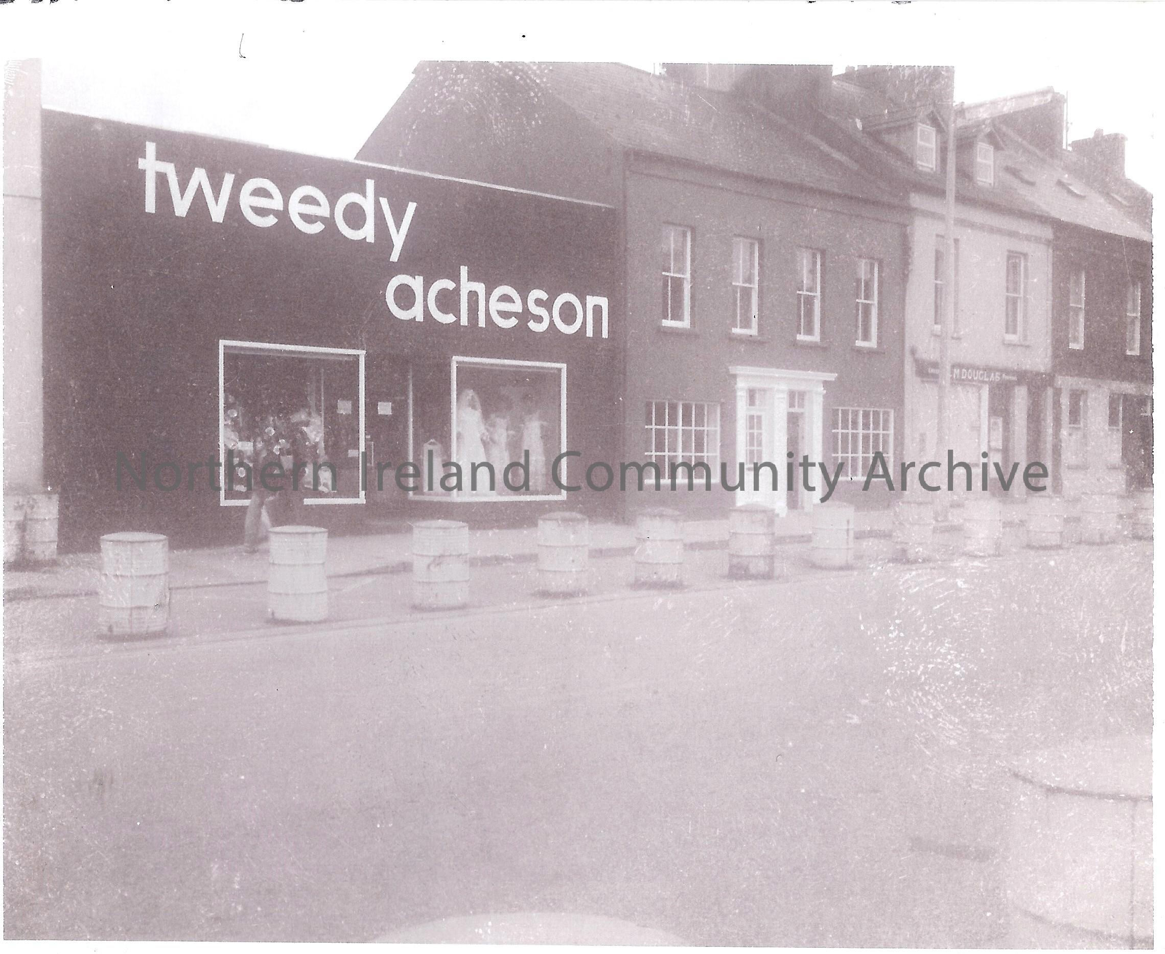 Tweedy Acheson Shop located on Main Street, Limavady Pictured here with barrels outside the shop which were to prevent cars from parking outside of the premises during the troubles.