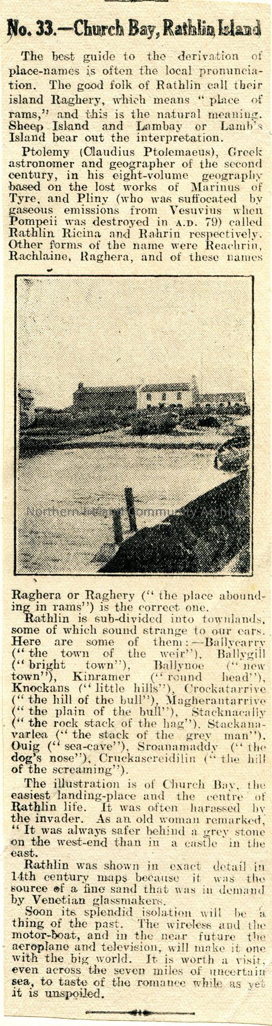 Two articles from a newspaper. Article cut from a newspaper titled, ‘No. 33. – Church Bay, Rathlin Island’. Re the origin of the name Rathlin / Ragher… – scan039c
