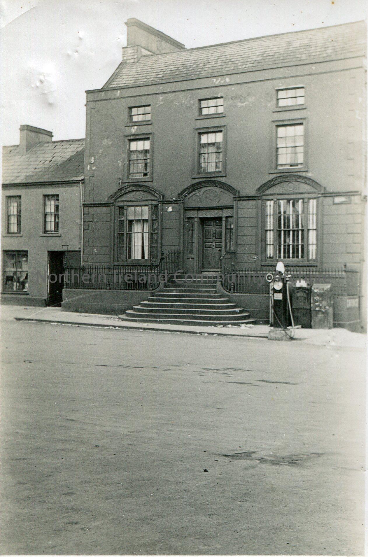 Two buildings on a street with sash windows. The building to the right has iron railings to the front and numerous steps to the front door.