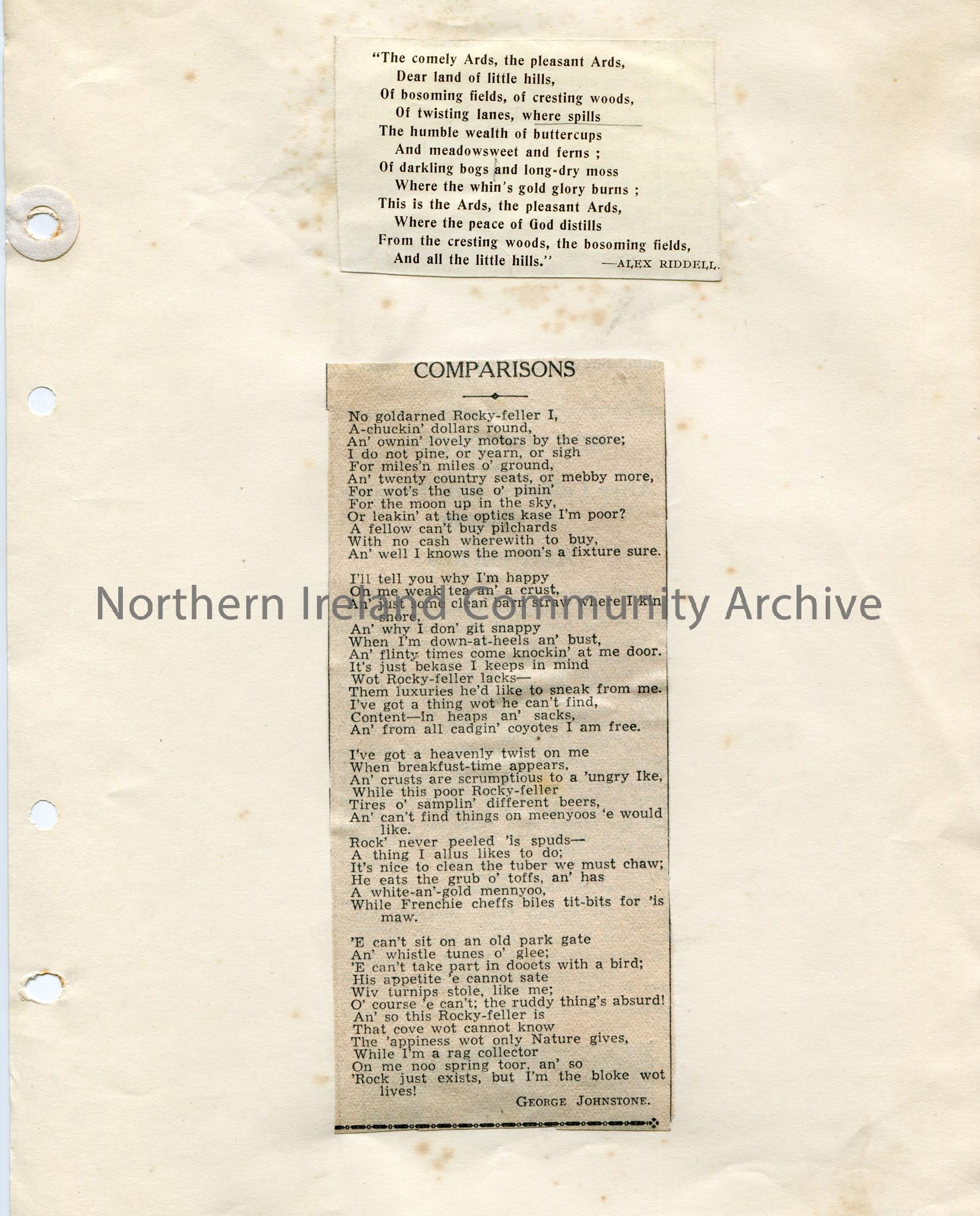 Two cuttings from a newspaper and publication of poems. One is re Ards by Alex Riddell and the other is titled, ‘Comparisons’ by George Johnstone re ‘…