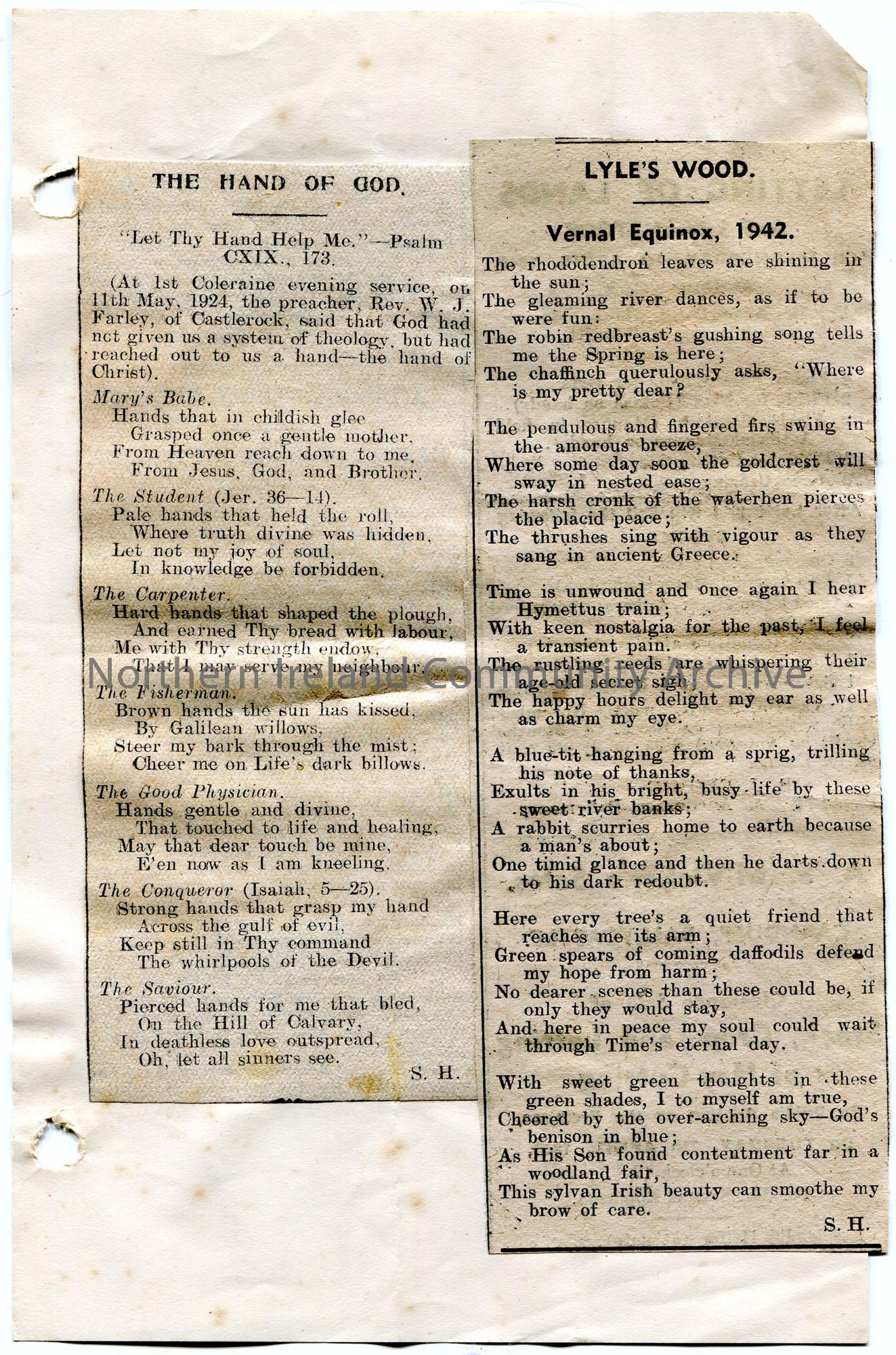 Two cuttings stuck to paper from a newspaper of two poems. One is titled, 'The Hand of God'. It mentions a 1st Coleraine evening service by preacher Rev W. J. Farley of Castlerock on 11th May, 1924. The other is titled, 'Lyle's Wood. Vernal Equinox, 1942'. Re Spring. Both are initialled 'S.H'.