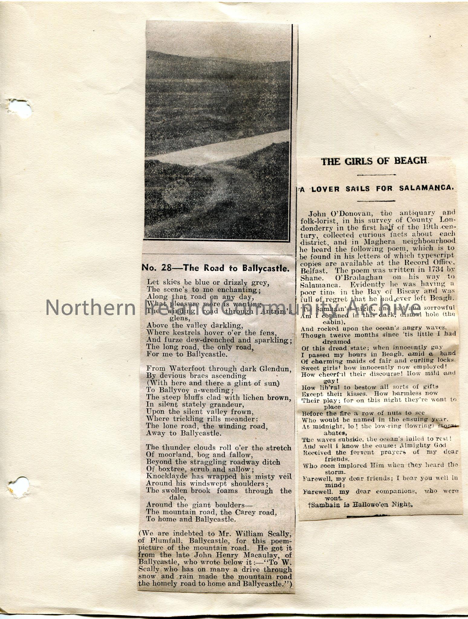 Two different newspaper articles cut out and stuck to paper. One is a poem titled, 'No. 28 - The Road to Ballycastle' and includes a photographic image of a mountain road. Picture provided by Mr William Scally of Plumfall, Ballycastle who got it from John Henry Macaulay of Ballycastle. The second article is a poem re Halloween night sent in by antiquary and folklorist John O'Donovan who heard it in Maghera. Poem written in 1734 by Shane.
