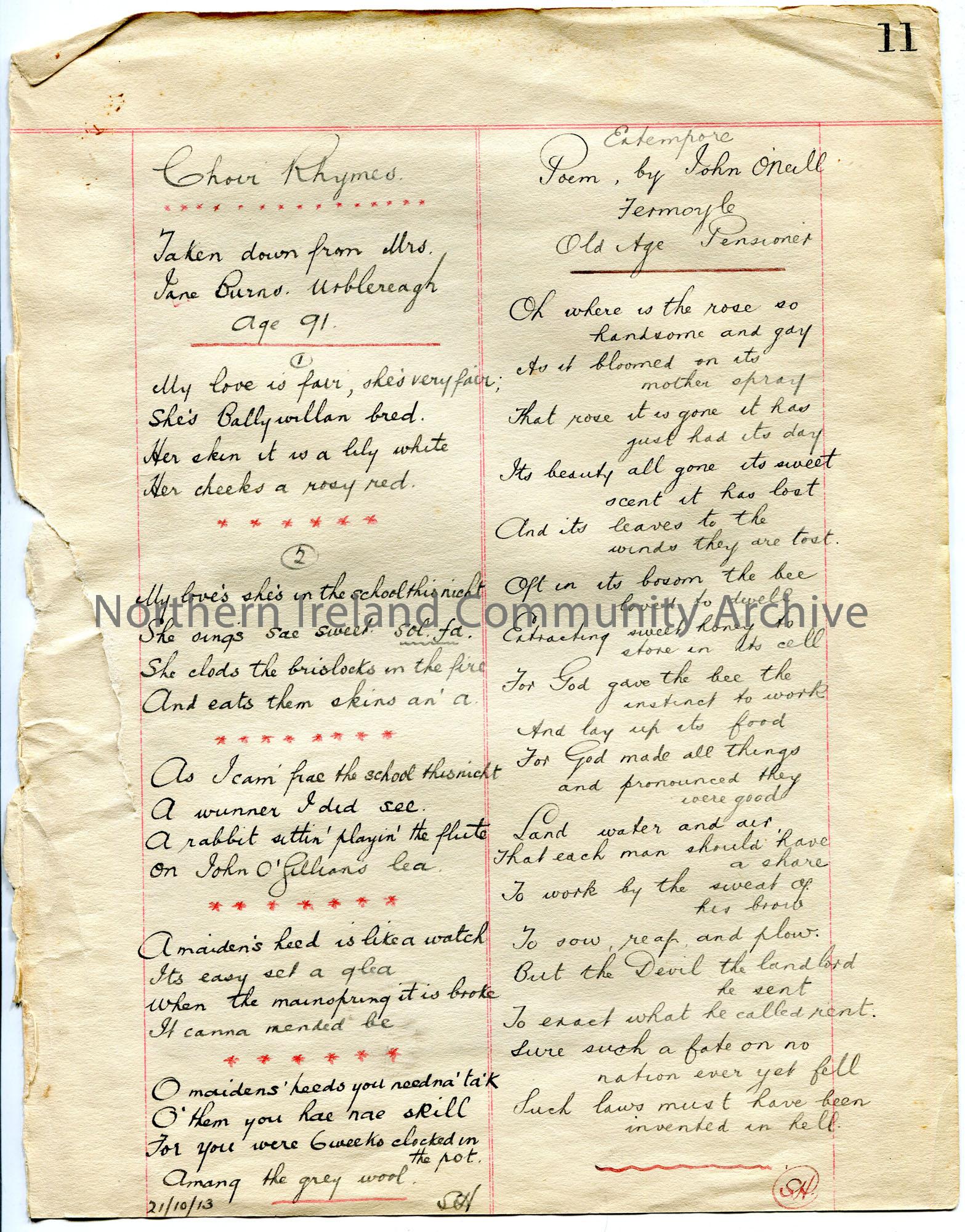 Two handwritten pieces. The piece on the left side are choir rhymes and notes that it was taken down from Mrs Jane Burns, Urblereagh. Age 91. Mentions Ballywillan. Initialled 'SH' and dated 21/10/13. On the right side of the page is a poem by John O'Neill, Fermoyle, Old Age Pensioner. Initialled 'SH'. 'Extempore' written at top of poem.