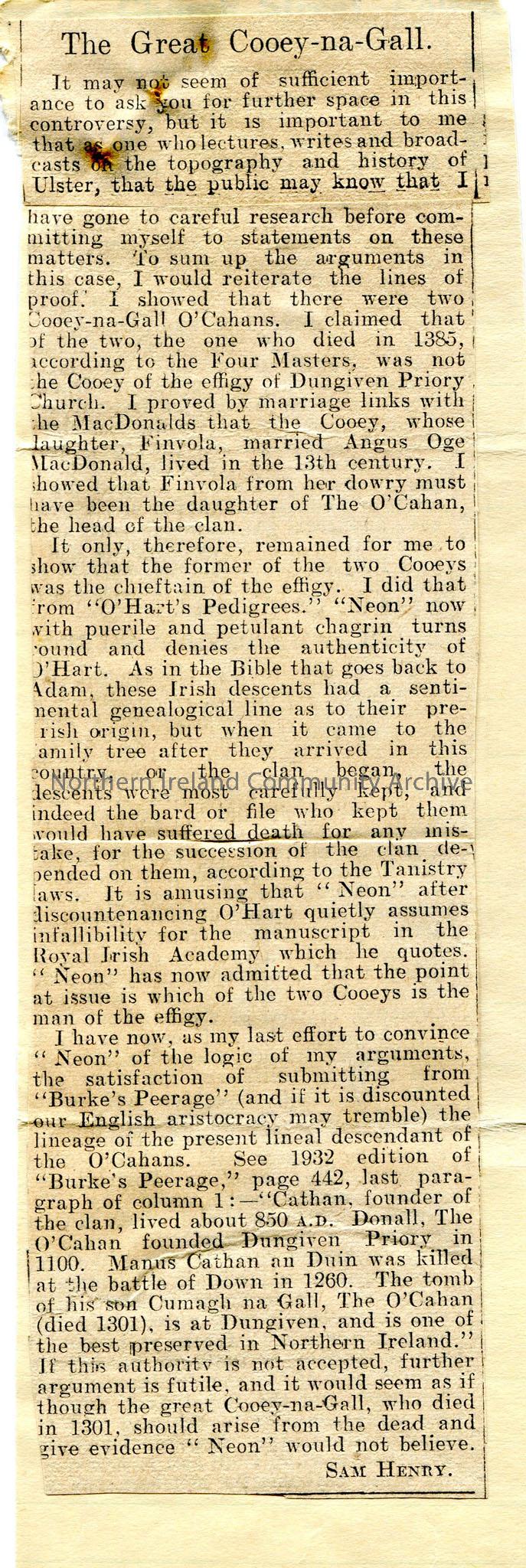 Two newspaper cuttings, affixed to each side of one piece of paper. One is letter from Sam Henry, ‘titled ‘The Great Cooey-na-gall’, re the O’Cahan cl…