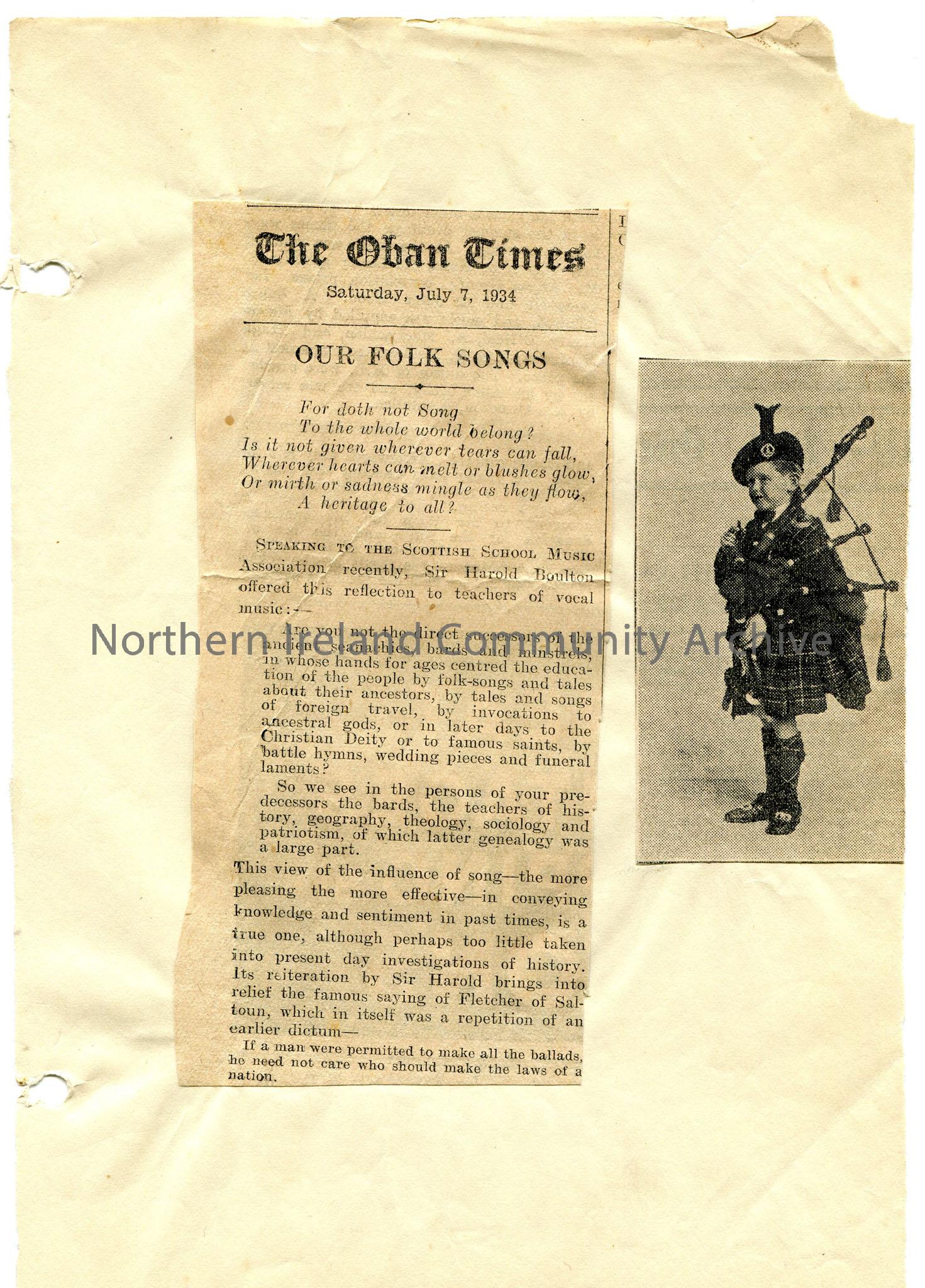 Two newspaper cuttings affixed to page – article on ‘Our Folk Songs’ and image of young piper.