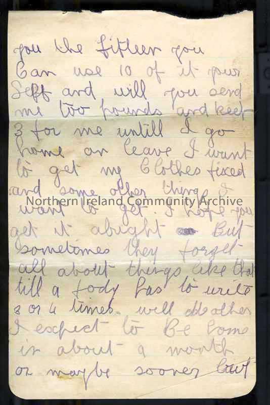 Two of 3 pages (joined along top edge) of handwritten letter in purple pencil from James to his mother. Has asked Paymaster to send £15 home - gives instructions for use (parents, self, clothes). Still using crutches - ? month before home on leave