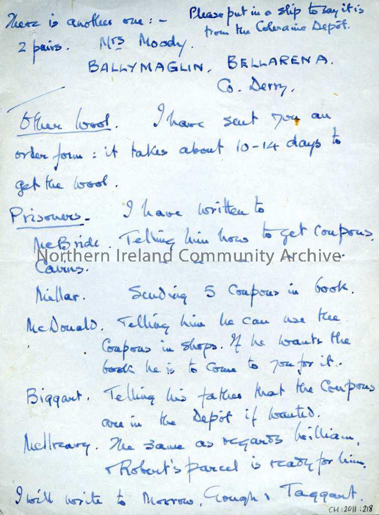 Two page, handwritten letter addressed to Mrs Robertson from Lady Taylor dated 25th May 1945. Addressed 'The Umbra, Magilligan, Londonderry'. Letter is regarding 'Jungle' wool, ladies to add to the list of knitters, prisoners and letters that Mrs Taylor has written to their family, coupn books and registers. Mrs Taylor is also notifying Mrs Robertson of her change of address to c/o Major Grove, Castle Grove, Letterkenny, Co.Donegal.