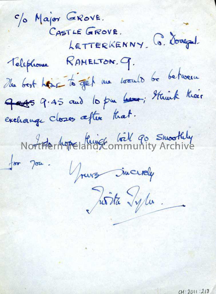 Two page, handwritten letter addressed to Mrs Robertson from Lady Taylor dated 25th May 1945. Addressed 'The Umbra, Magilligan, Londonderry'. Letter is regarding 'Jungle' wool, ladies to add to the list of knitters, prisoners and letters that Mrs Taylor has written to their family, coupn books and registers. Mrs Taylor is also notifying Mrs Robertson of her change of address to c/o Major Grove, Castle Grove, Letterkenny, Co.Donegal.