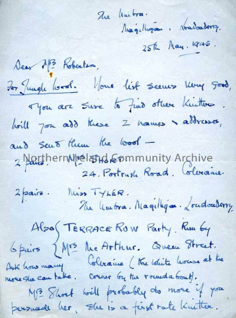 Two page, handwritten letter addressed to Mrs Robertson from Lady Taylor dated 25th May 1945. Addressed 'The Umbra, Magilligan, Londonderry'. Letter is regarding 'Jungle' wool, ladies to add to the list of knitters, prisoners and letters that Mrs Taylor has written to their family, coupn books and registers. Mrs Taylor is also notifying Mrs Robertson of her change of address to c/o Major Grove, Castle Grove, Letterkenny, Co.Donegal.