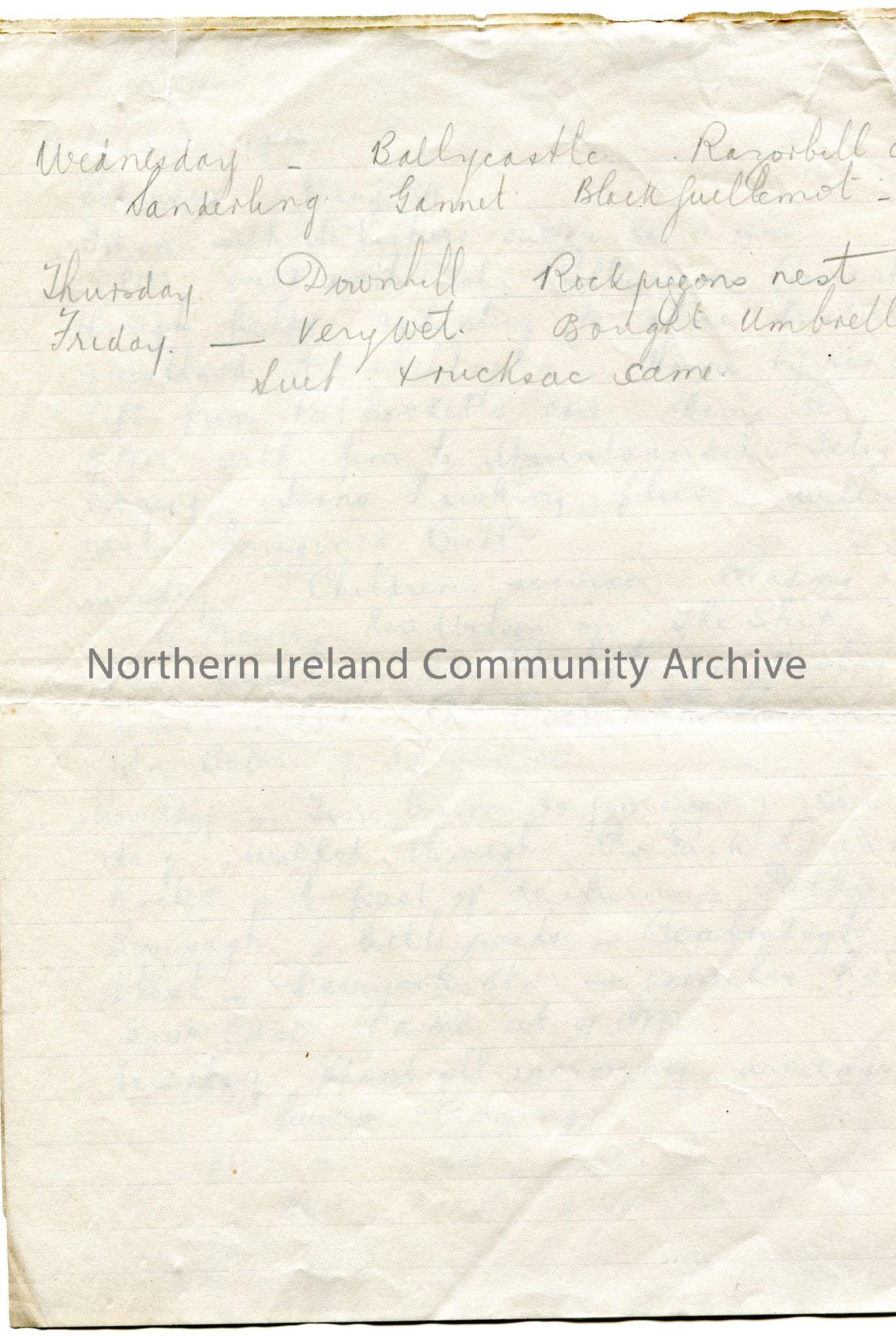 Two pages attached together of handwritten notes titled, 'Holiday 1913'. Dated Saturday May 24. Details daily activities from Saturday-Friday. On Saturday went to Ballycairn and Mountsandel. On Sunday attended children's service. Took train to Limavady on Monday. On Tuesday went to Castleroe Glen with Jamie. On Wednesday went to Ballycastle. Went to Downhill on Thursday.