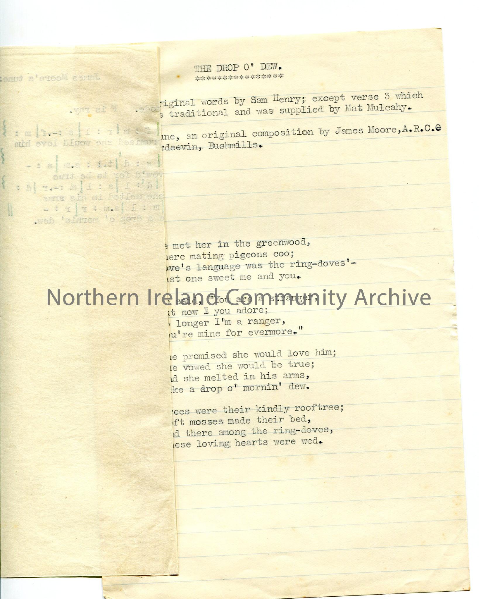 Two pages glued together - top one obscures part of bottom one but both relate to same song, composed by various, named. Top - typed words to one verse and tonic sol-fa notation to 'James Moore's Tune'; bottom - typed words to song 'The Drop O' Dew' (verse 3 is the verse given on top page).
