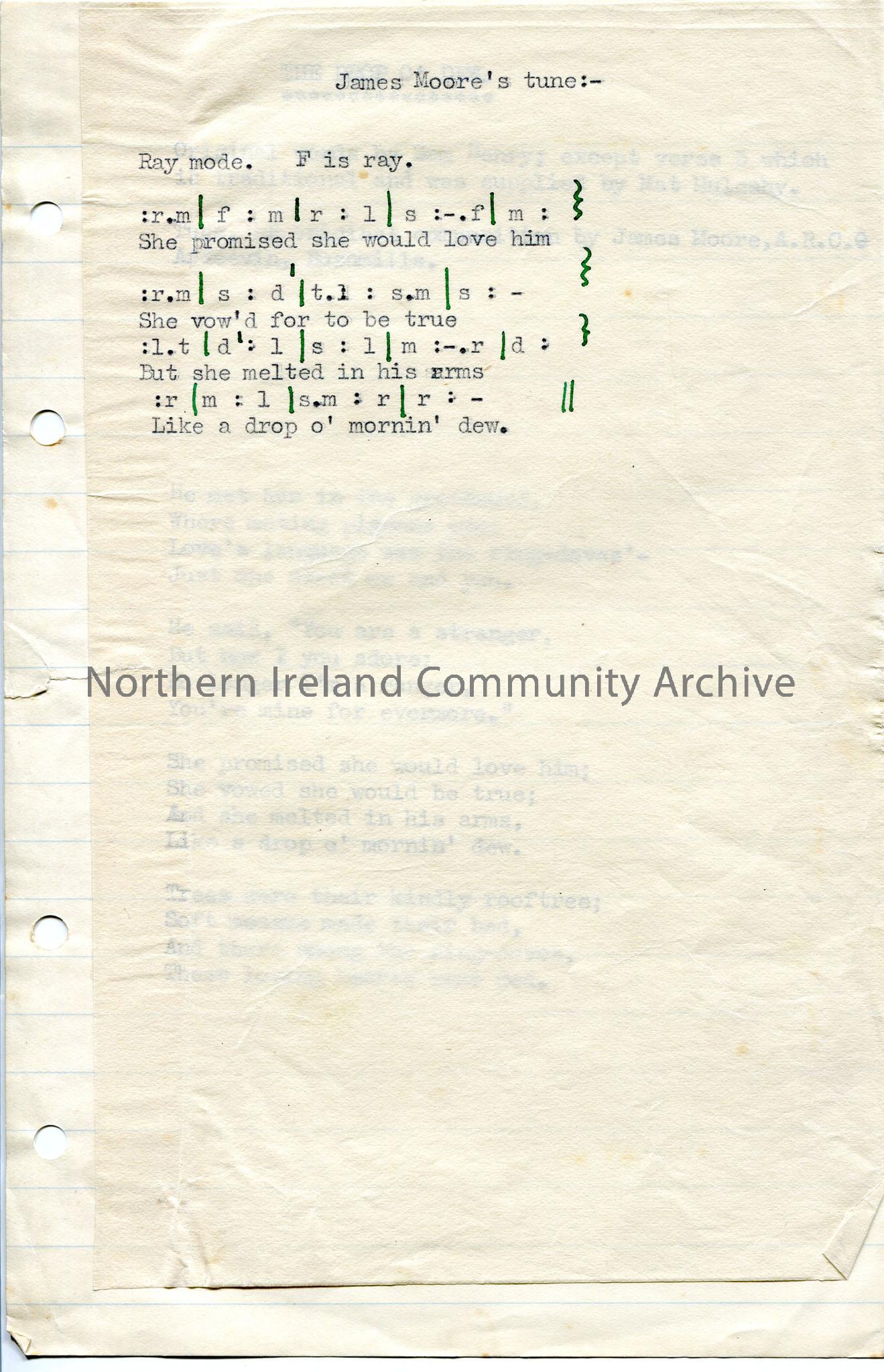 Two pages glued together - top one obscures part of bottom one but both relate to same song, composed by various, named. Top - typed words to one verse and tonic sol-fa notation to 'James Moore's Tune'; bottom - typed words to song 'The Drop O' Dew' (verse 3 is the verse given on top page).